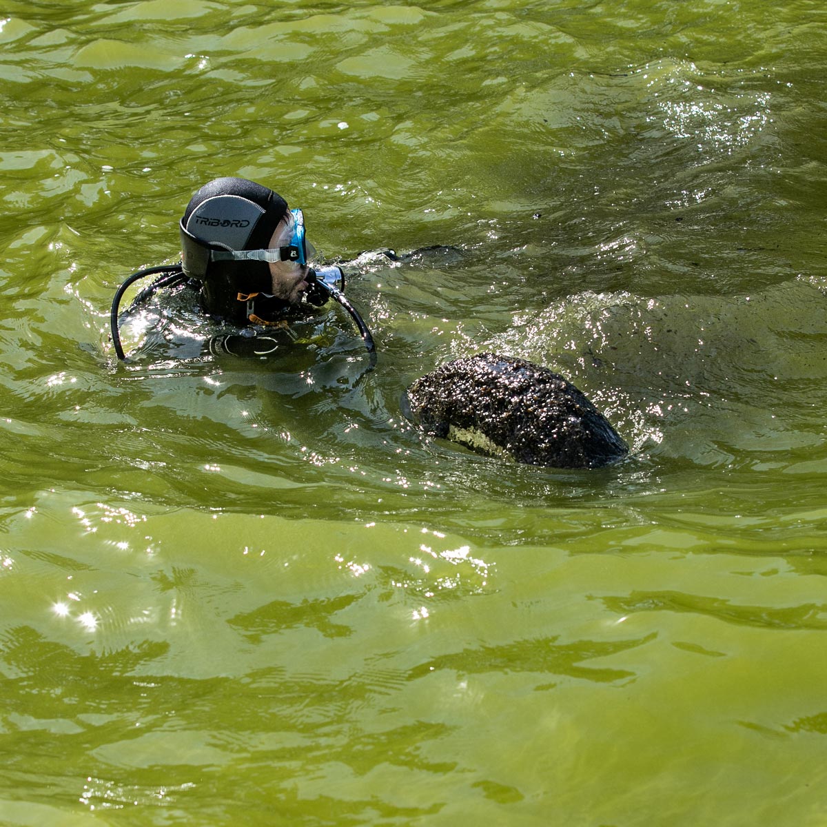 Nella foto, un sommozzatore recupera un copertone. © Andrea Ramani